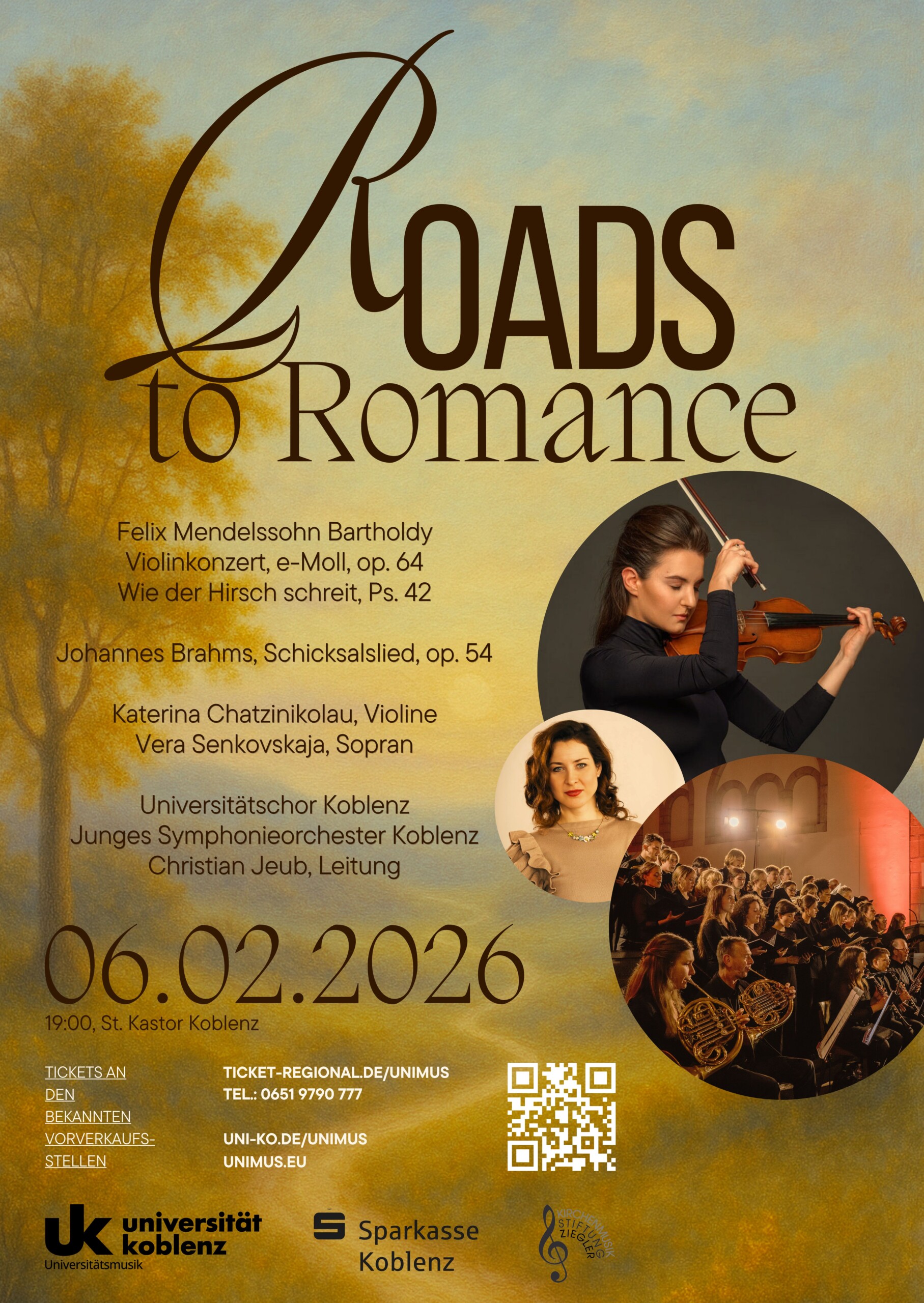 Wege in die Romantik stellt uns das aktuelle Semesterkonzert der Universitätsmusik Koblenz vor. Das Junge Symphonieorchester Koblenz und die renommierte Violin-Solistin, Katerina Chatzinikolau, präsentieren Mendelssohns berühmtes Violinkonzert, e-moll, das uns von der sehnsuchtvollen Eröffnung bis zum jubelnden Finale die Leidenschaft und Eleganz der Tonsprache Mendelsohns spüren lässt. Seine Psalmvertonung „Wie der Hirsch schreit nach frischen Wasser“ spendet Trost, drückt den Wunsch nach Taufe und Heimat im Glauben aus. Die Komposition „Schicksalslied“ vermittelt in Ihrer existentiellen Sehnsucht die Zerrissenheit zwischen Ideal und Wirklichkeit. Das Werk bleibt in seinem Ende offen und gehört zu den schönsten Kompositionen von Johannes Brahms.
